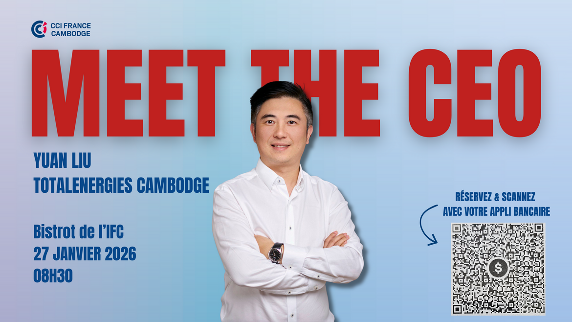 La CCI France Cambodge vous invite à son prochain Meet the CEO, le mardi 27 janvier 2026 à 8h30, au Bistrot de l’Institut Français du Cambodge.À cette occasion, nous aurons le plaisir d’accueillir Yuan Liu, Directeur général de TotalEnergies Cambodge. Il partagera son parcours de dirigeant d'un grand groupe français au Cambodge, sa vision des enjeux actuels du secteur de l’énergie, ainsi que la stratégie de développement de TotalEnergies dans le pays.