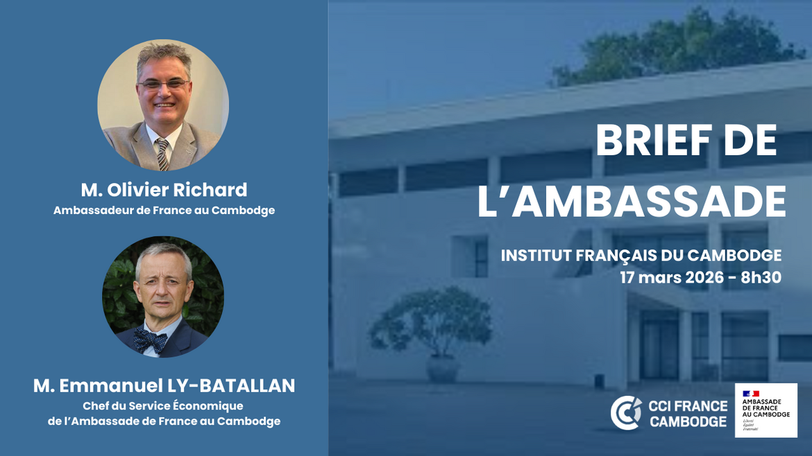 La CCI France Cambodge a le plaisir de vous convier à un brief de l'Ambassade de France au Cambodge, le mercredi 17 mars 2026 à 8h30 à l'Institut français du Cambodge.